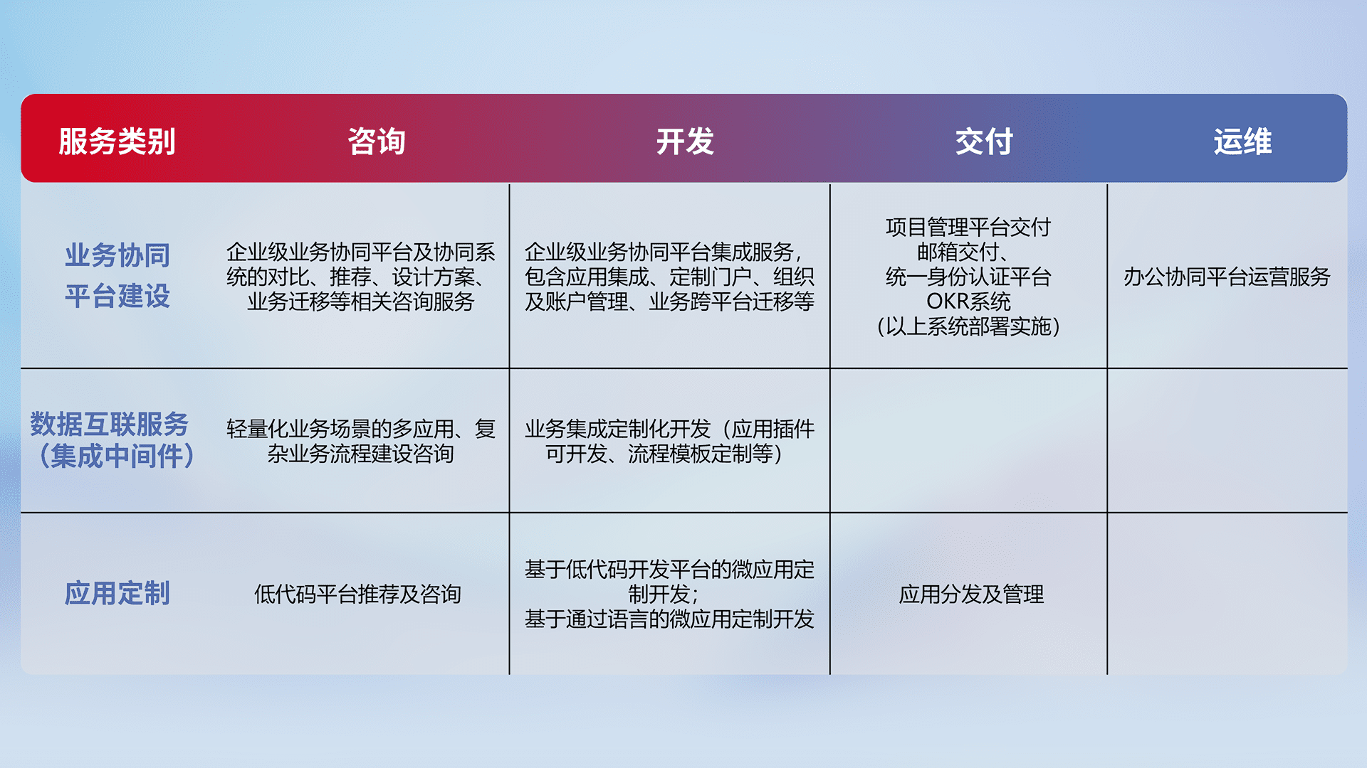 针对钉钉、、、、企微、、、、IDaas等平台级产品提供产品的规划、、、、方案、、、、交付、、、定制化开发等服务,,,,实现如统一协同办公、、智能客户服务、、、、混合会议管理、、、智能数据查询、、、等业务场景,,,,实现数字化转型。。